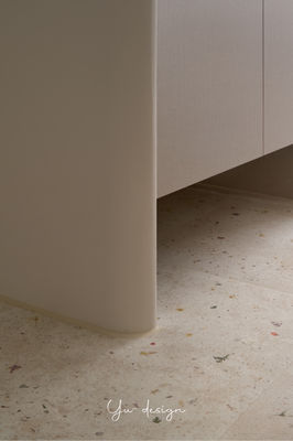 入口落塵區,選用仿髒的白色超耐磨地板,上方低調的植栽圖樣,在腳下成為輕盈又細緻的點綴。為了發揮最佳坪效,設計師規劃一座三面收納櫃,玄關側的抽屜,能隨手放置出門的小物,同時也能用於備餐平台、收納廚房電器。這樣的設計,巧妙串聯入口與餐桌的需求,讓家的各個區域,轉化為流暢又完整的生活場域。