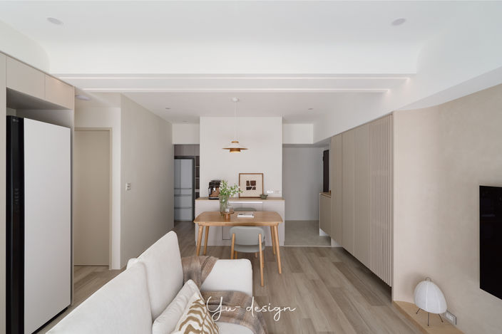 這個空間如同感性與理性平衡的絕佳範例,在看似簡單的設計中,藏入圓潤的線條和謹慎的考量。以奶茶色、溫潤的木質為基底,再搭配上白色、淺色系的傢俱、吊燈,營造出溫和清新的氛圍。它不僅裝載了屋主對生活的理想樣貌,更將溫柔的守護一家三口,度過每個成長的瞬間。