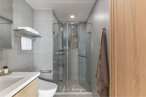 主臥以隔柵分隔睡眠區和衣櫃,另成一更衣室,避免面對整面櫃體的壓迫感;格柵牆取代實牆也降低視線阻隔,使整體採光和空氣流暢,增加場域的互動性,消弭空間分隔的狹隘感。主浴將盥洗區、沐浴間與馬桶區分開作成三分離式衛浴,增加家庭成員各自使用的機能性;分別使用透光不透視的烤漆玻璃和長虹玻璃作為門片,其相異的細緻紋理和朦朧效果增添空間質感,也消弭分區壓迫感。沐浴間地面選用木紋磚,與白色系衛浴設備、淺灰色壁磚營造清新的日式木質風。一壁面跳色使用窯變色不規則藍仿馬賽克磚,將幾何方格花磚運用於盥洗區與馬通區地坪,活用選材嫁接台灣風情。